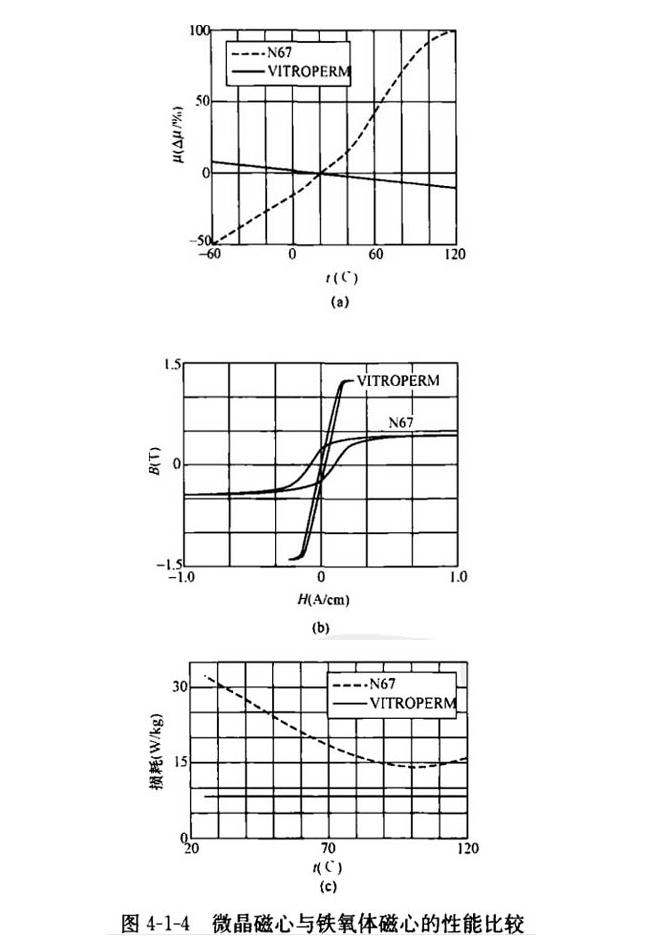 目前,高頻變壓器一般選用鐵氧體磁芯。VITROPERM 500F鐵基超微晶磁芯與德國(guó)西門(mén)子公司生產(chǎn)的N67系列鐵氧體磁芯的性能比較如圖所示。圖a為磁導(dǎo)率的相對(duì)變化率與溫度的關(guān)系曲線(xiàn);圖b為磁感應(yīng)強(qiáng)度(B)與矯頑力(H)的關(guān)系曲線(xiàn);圖c則為損耗—溫度曲線(xiàn)?! ?..